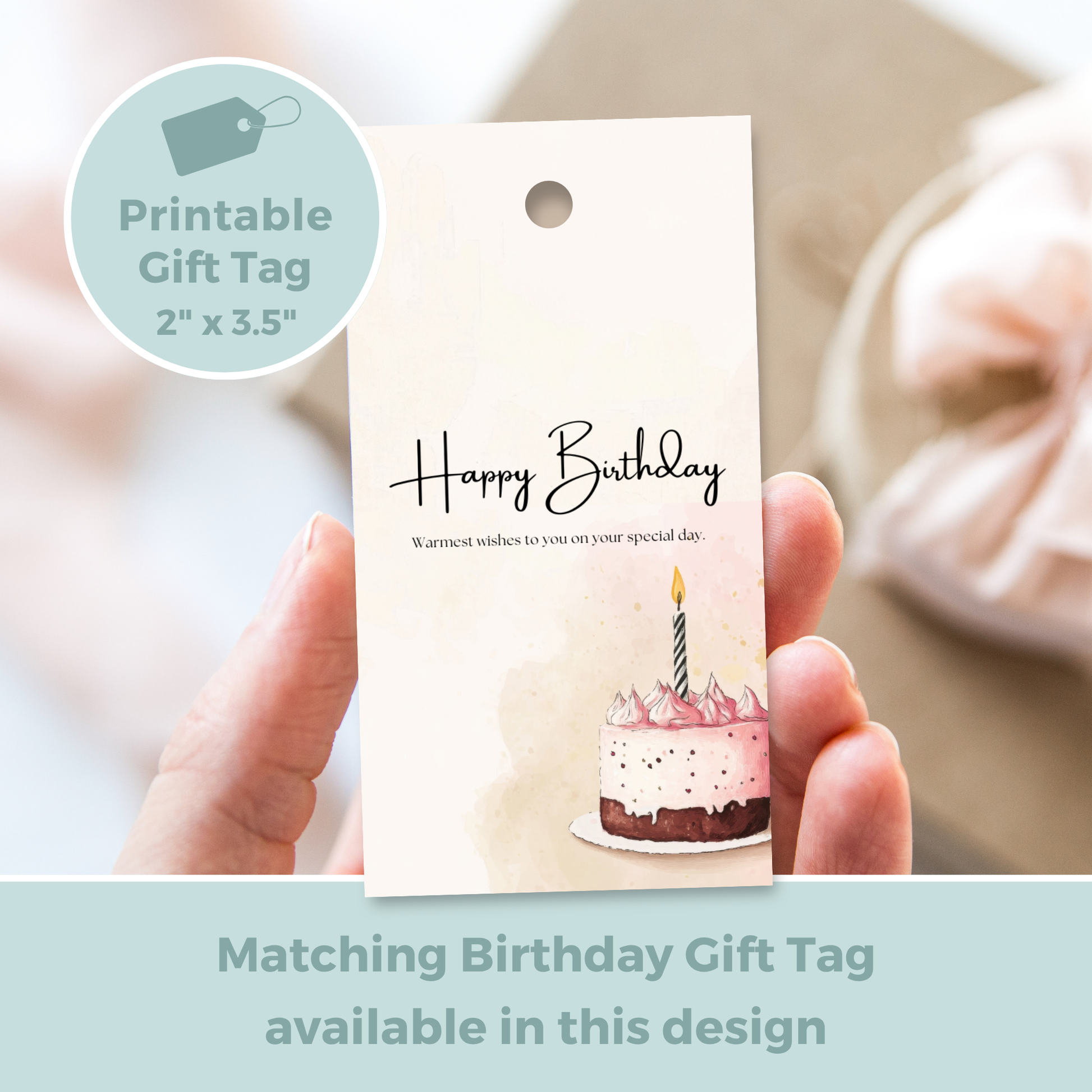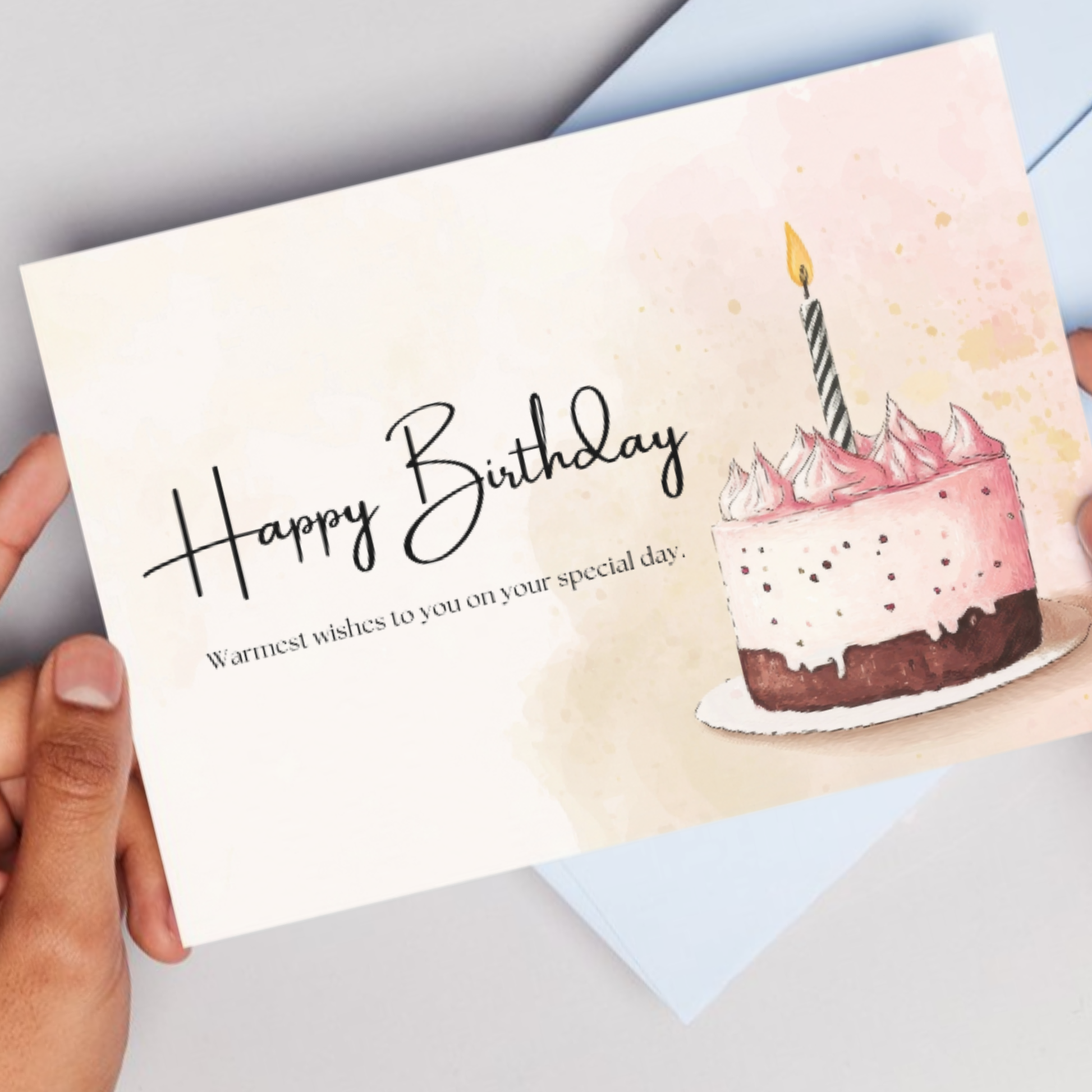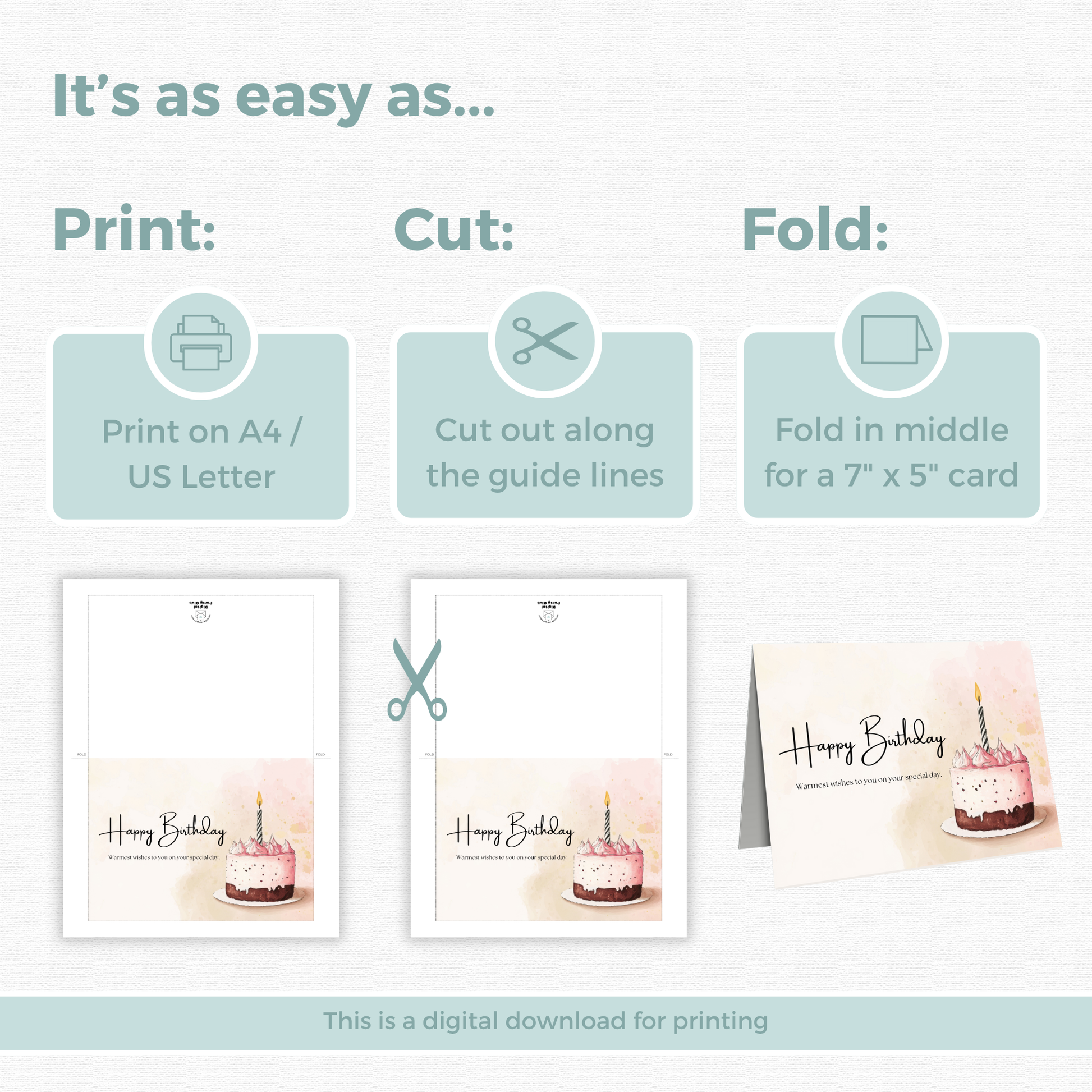 Celebrate in style with this elegant printable birthday card featuring a watercolour cake and heartfelt message.