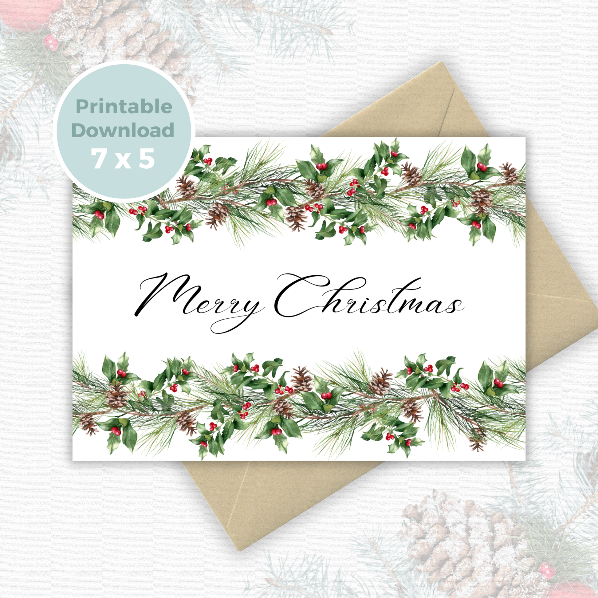 Celebrate the season with this printable Christmas card (7x5 inches) featuring a beautiful pinecone and holly watercolor design. Perfect as a digital holiday greeting card, this instant download lets you print at home for a quick, eco-friendly, and last-minute Christmas card. A lovely way to send warm festive wishes with a touch of elegance.