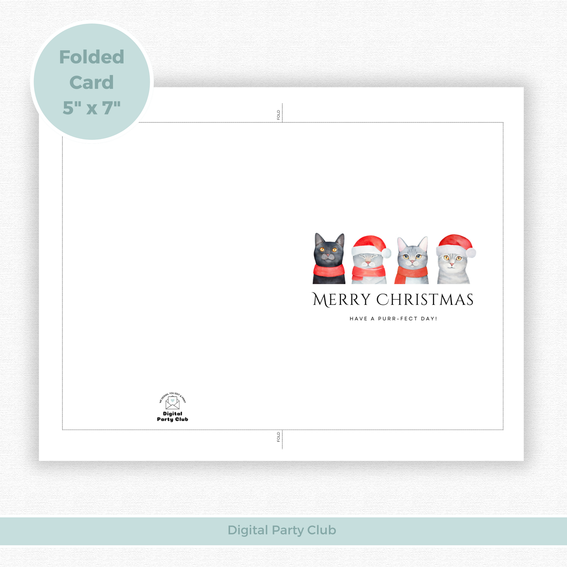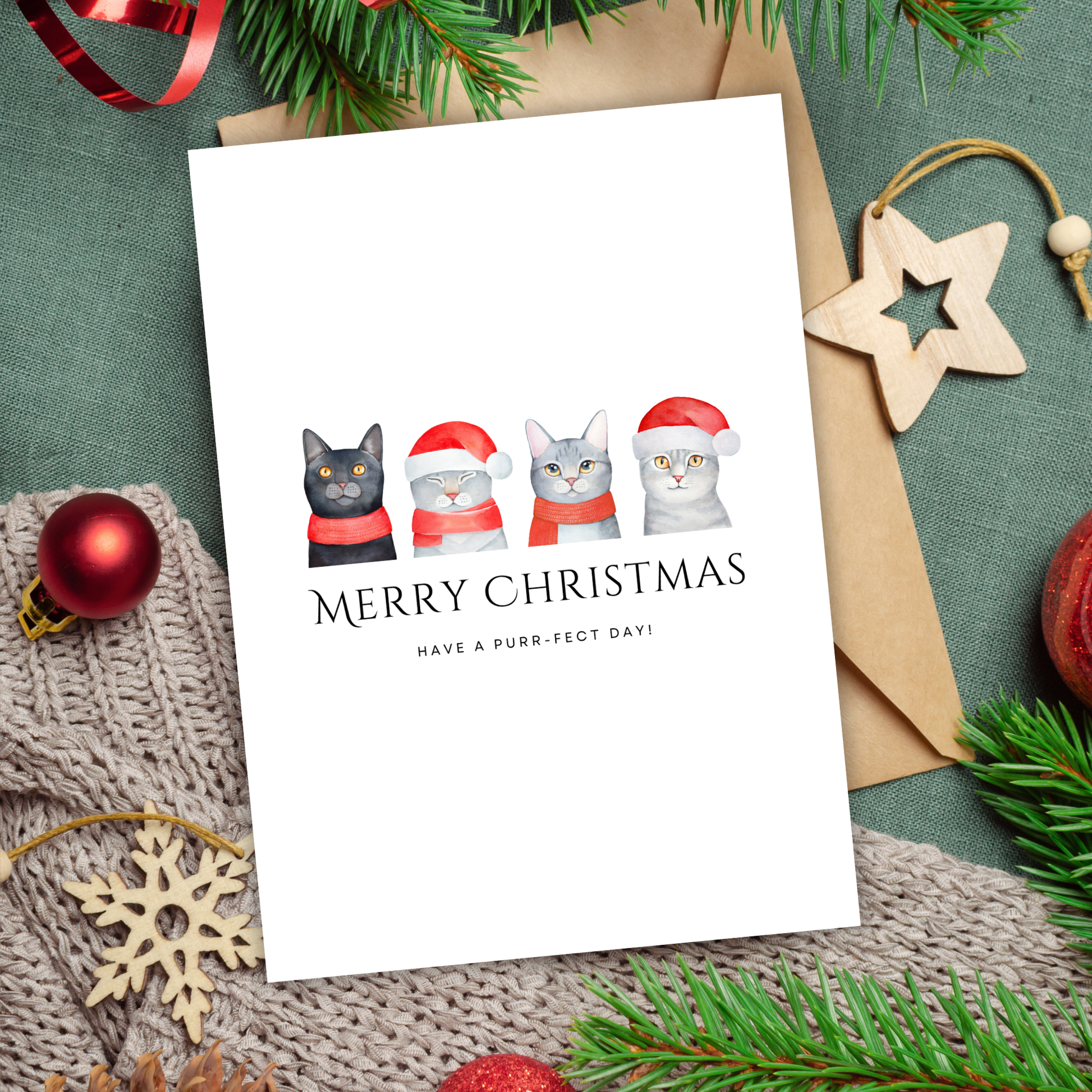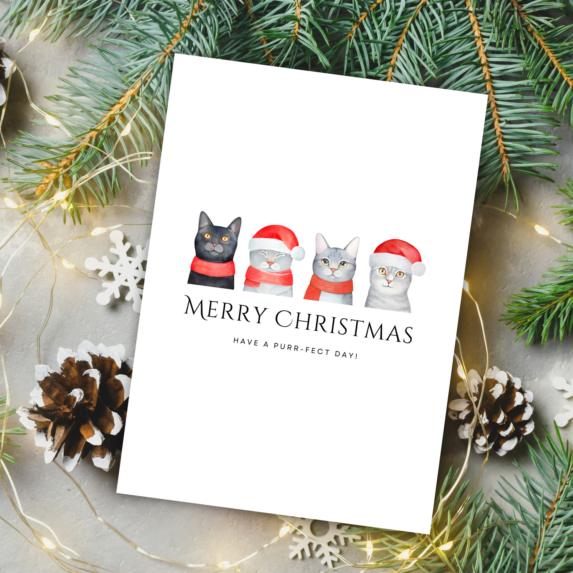 Celebrate the holidays with this adorable Christmas card featuring cats sitting in a row and the message, "Have the Purr-fect Christmas!" Perfect for cat lovers!