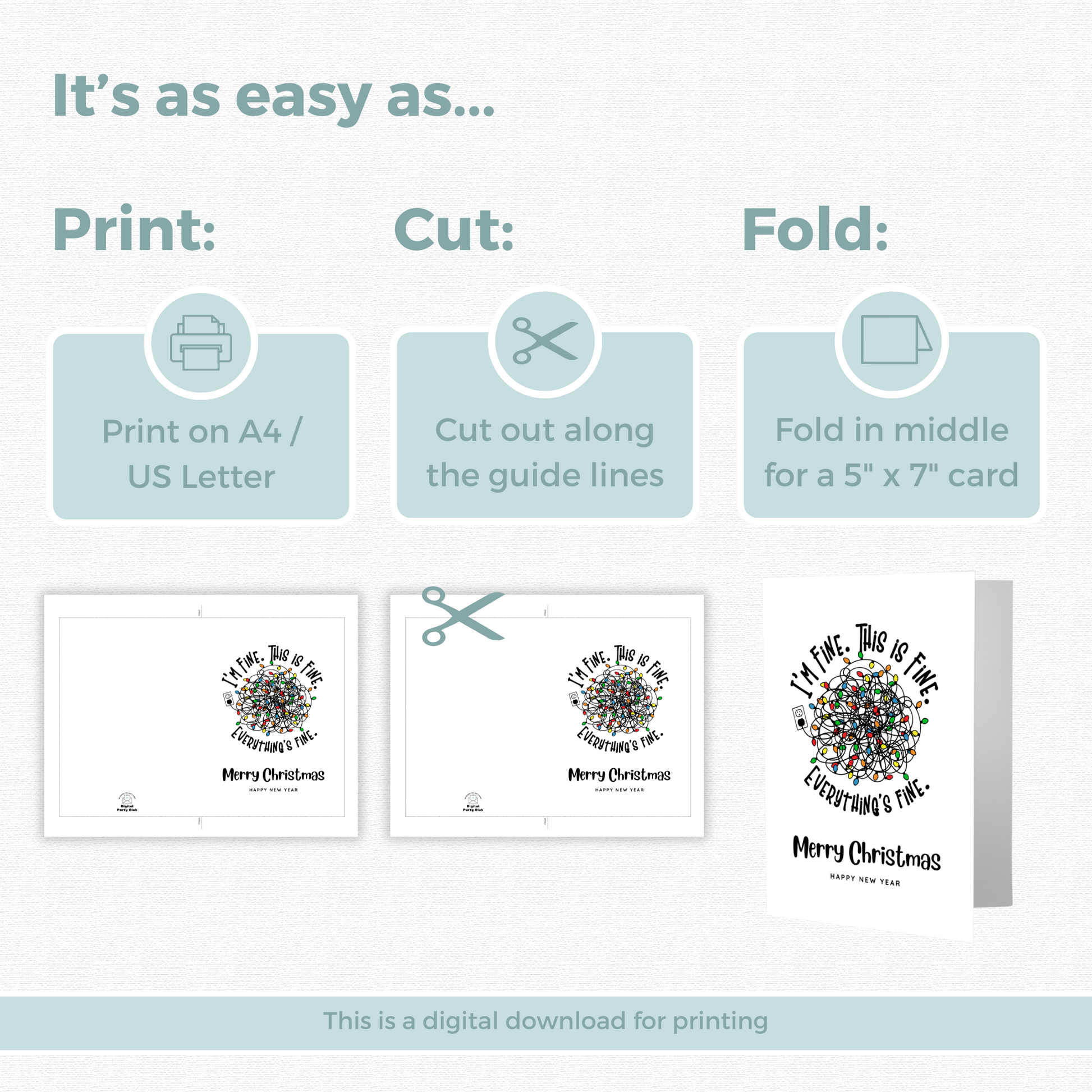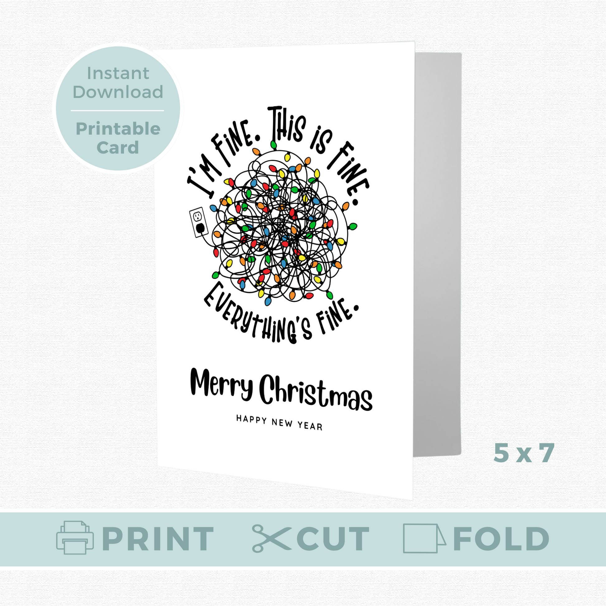 This Printable Funny Christmas Card with tangled tree lights and the humorous saying "I'm Fine, This is Fine, Everything's Fine" is perfect for spreading laughter and light-hearted holiday cheer. It's the ideal card for anyone who can relate to the chaos of the holiday season! Easy to print at home, this unique design is sure to bring a smile to your friends and family, making it a great choice for those who love humor with their holiday greetings.