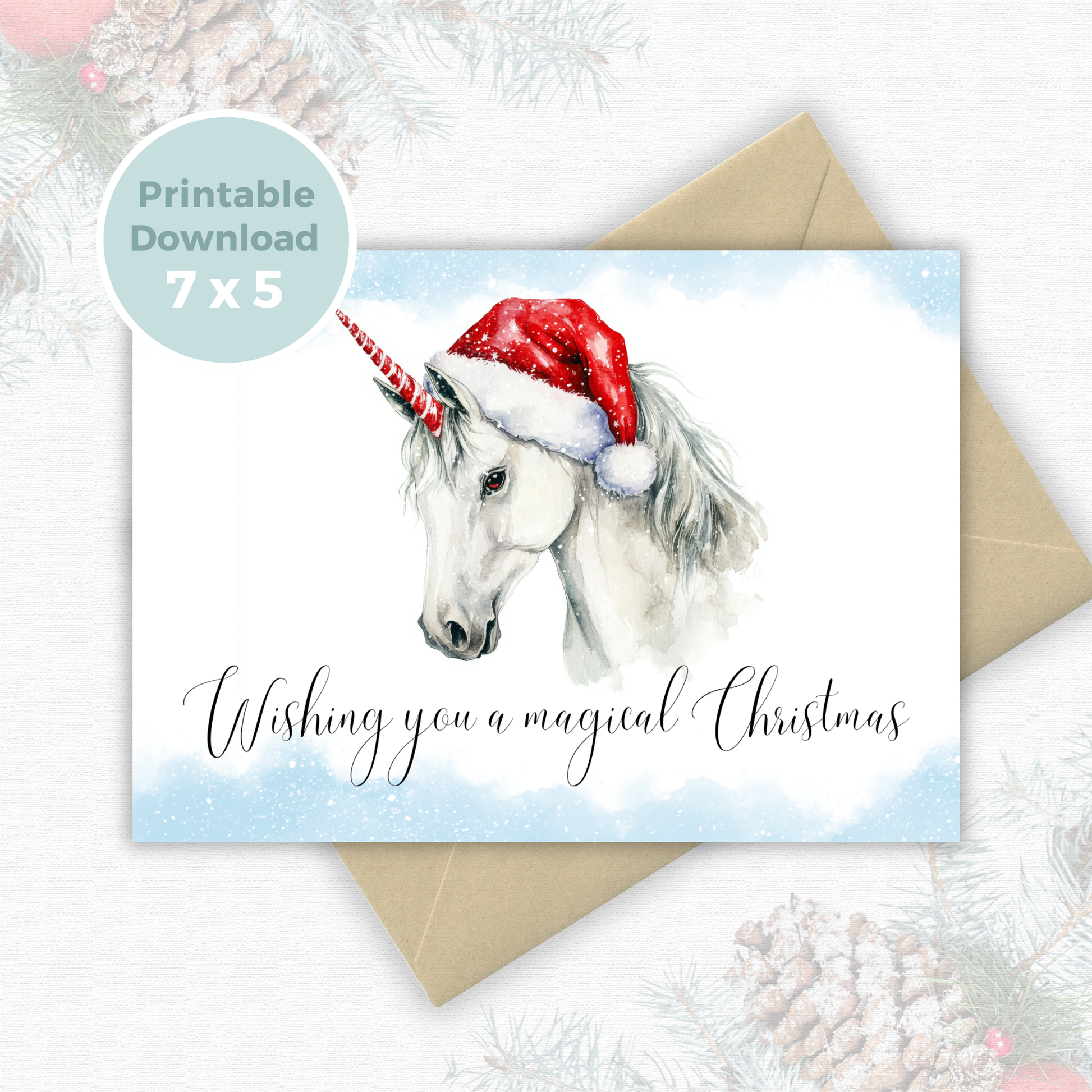 Send holiday magic with this enchanting Christmas card featuring a white unicorn and the message, "Wishing You a Magical Christmas!"