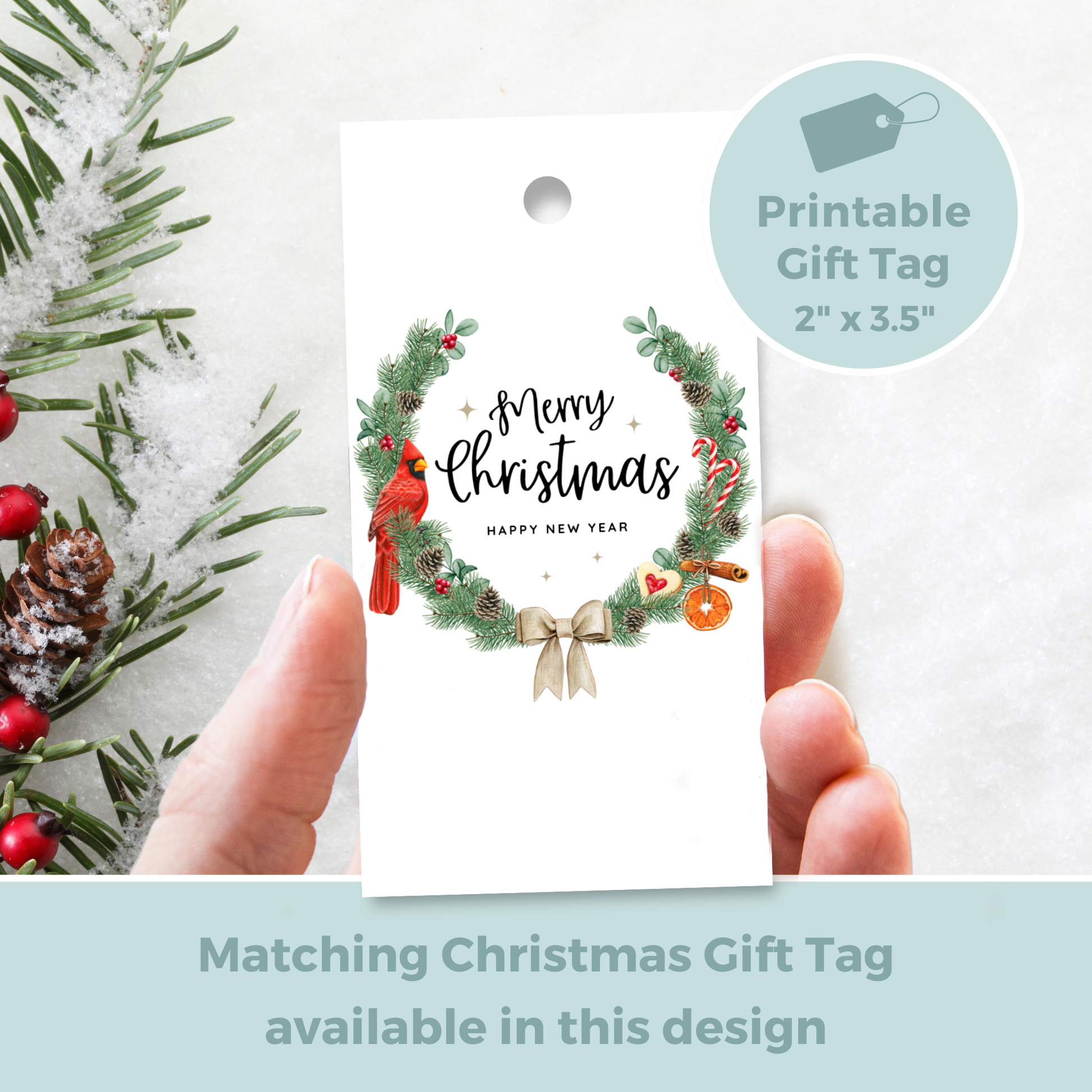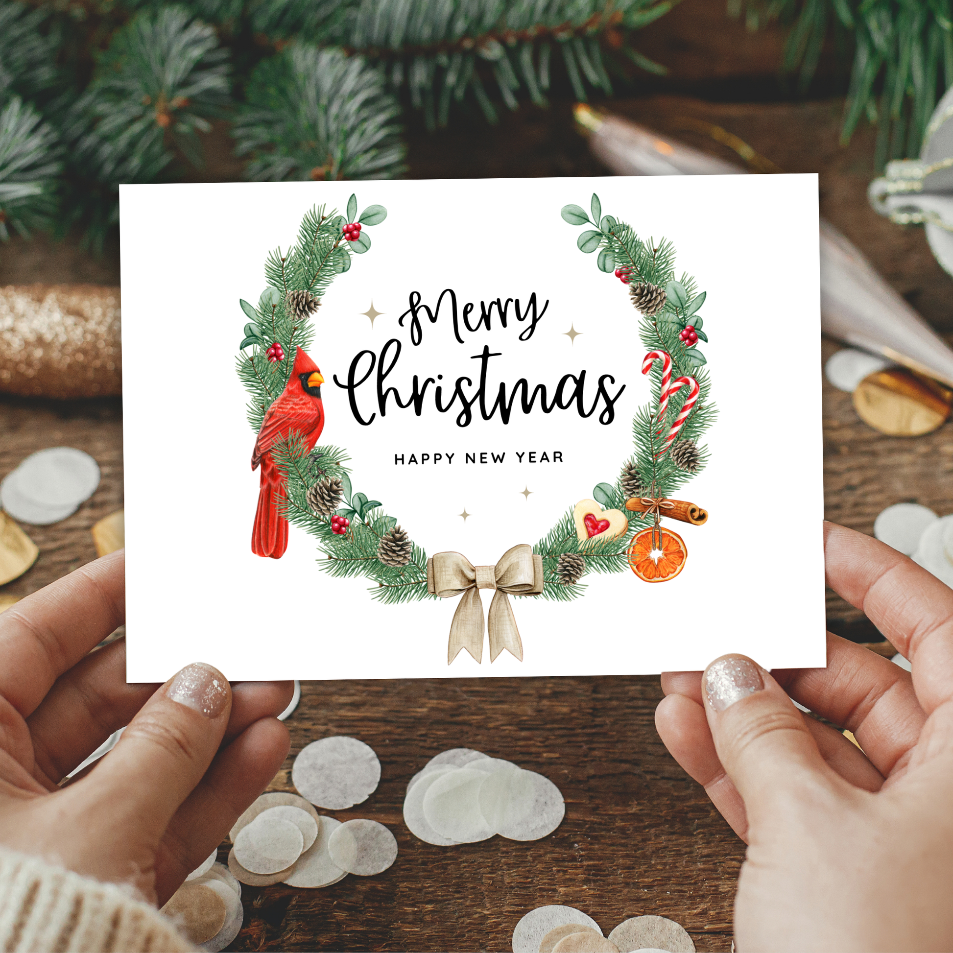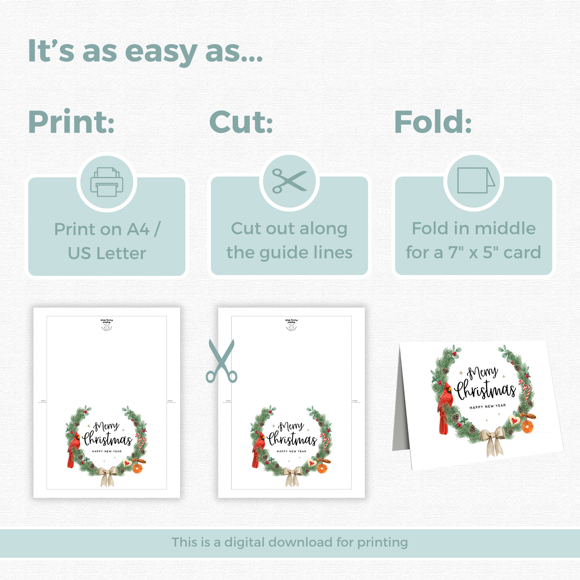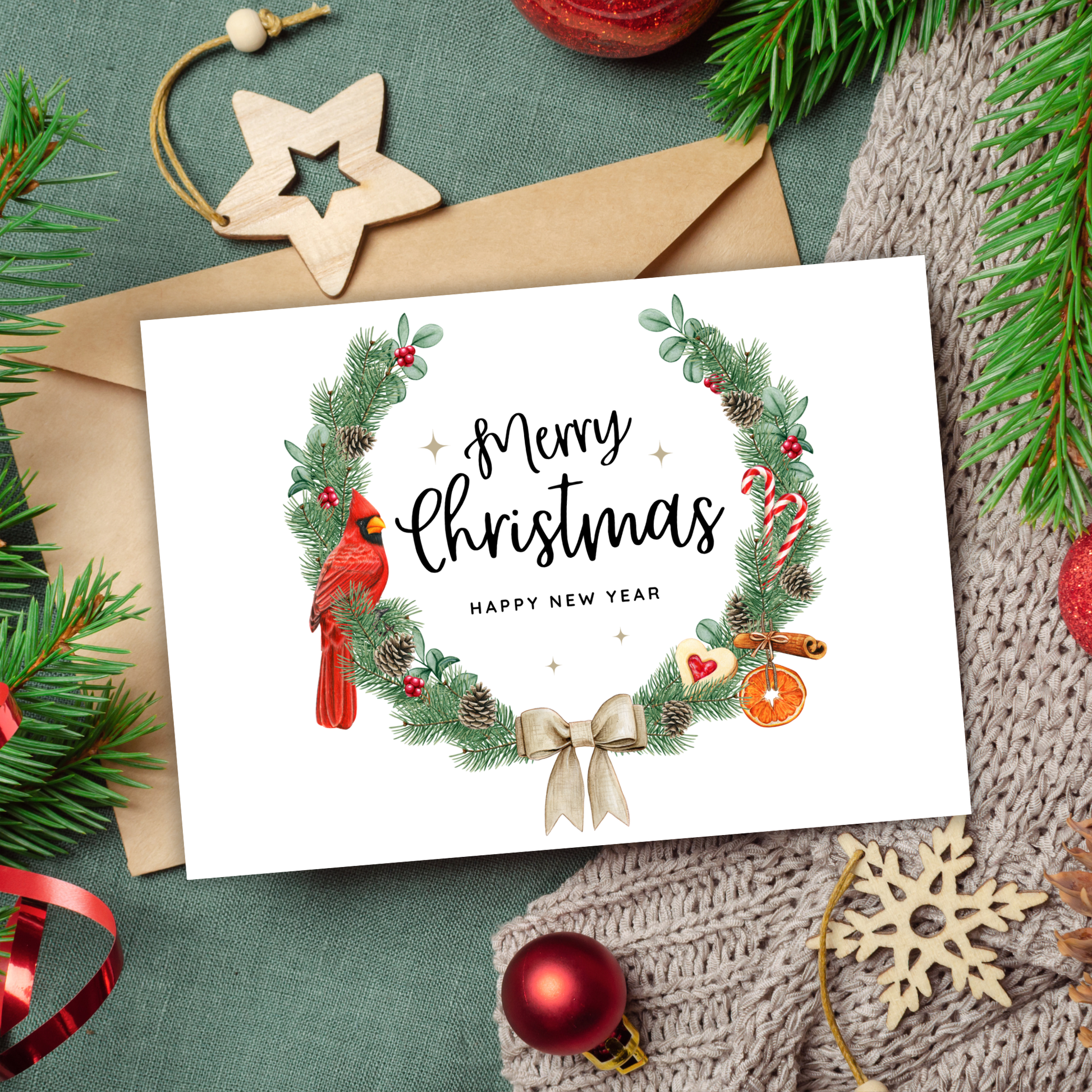 Send Christmas greetings in style with our Printable Merry Christmas Card with Christmas wreath design. This stunning Christmas card is the perfect way to send warm wishes to your loved ones.
