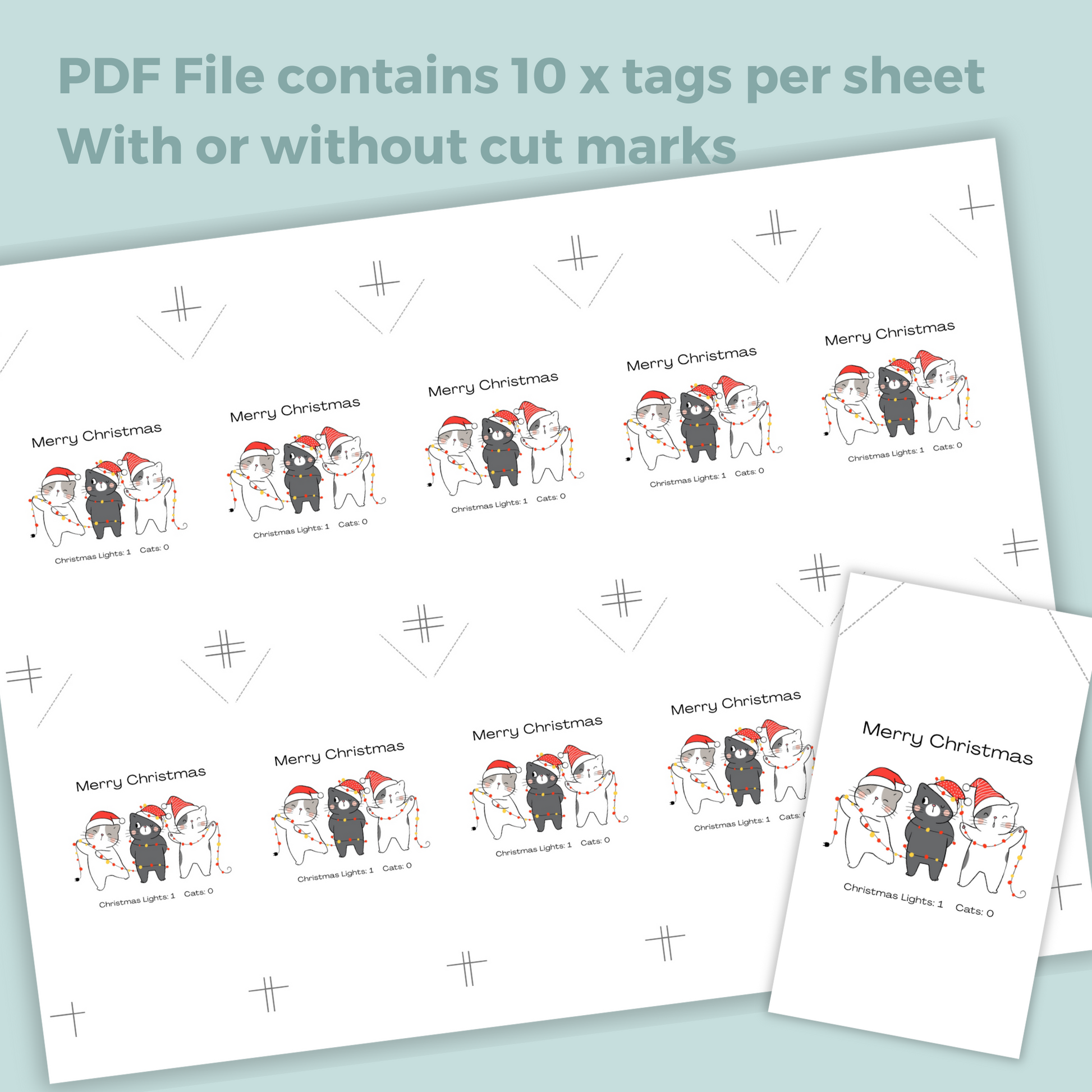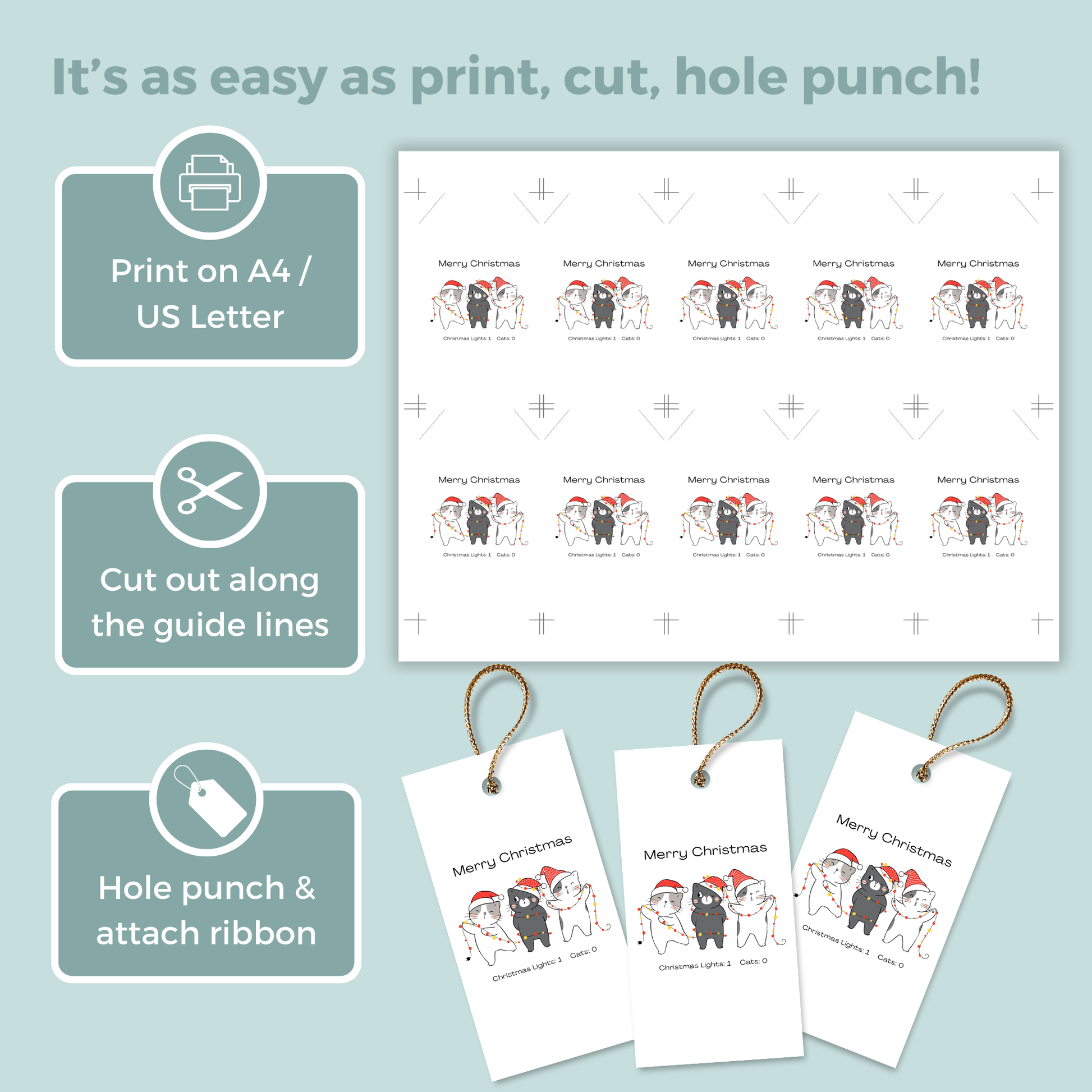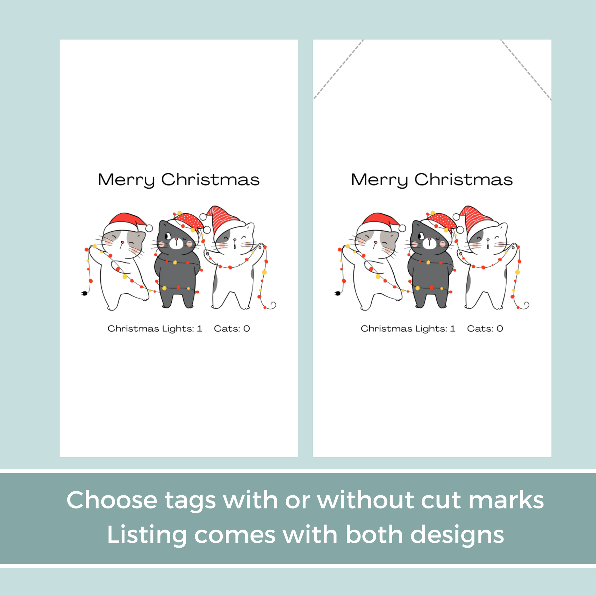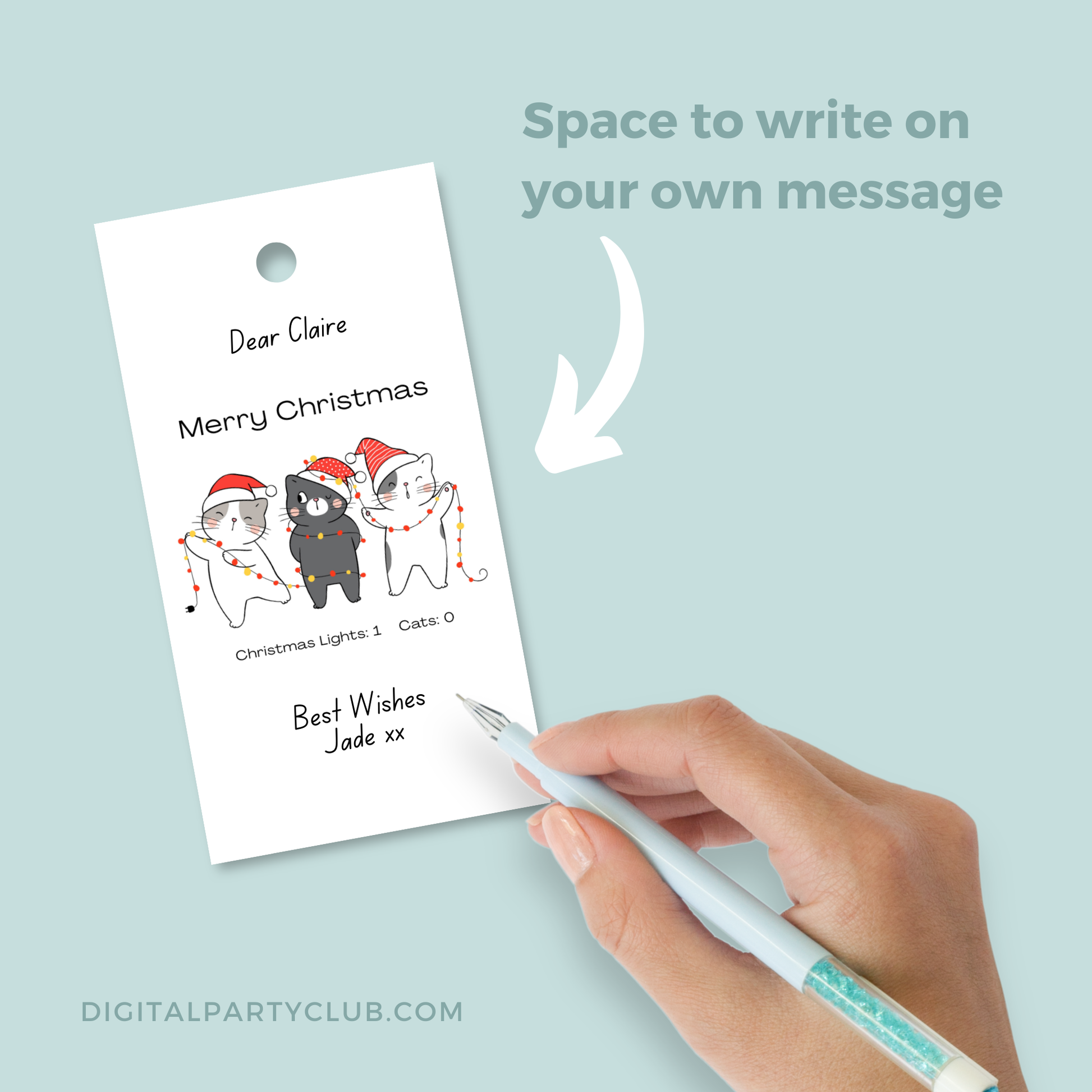 Make them smile with this adorable printable Christmas tag featuring three cats tangled in festive lights. An instant download - perfect for cat lovers, holiday greetings, or last-minute Christmas cheer.