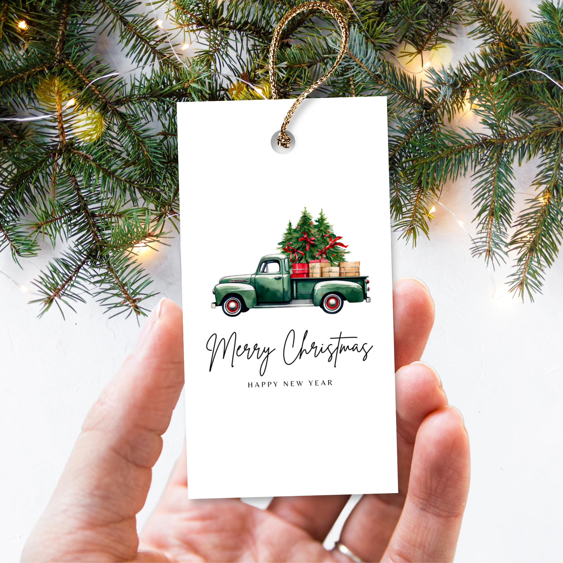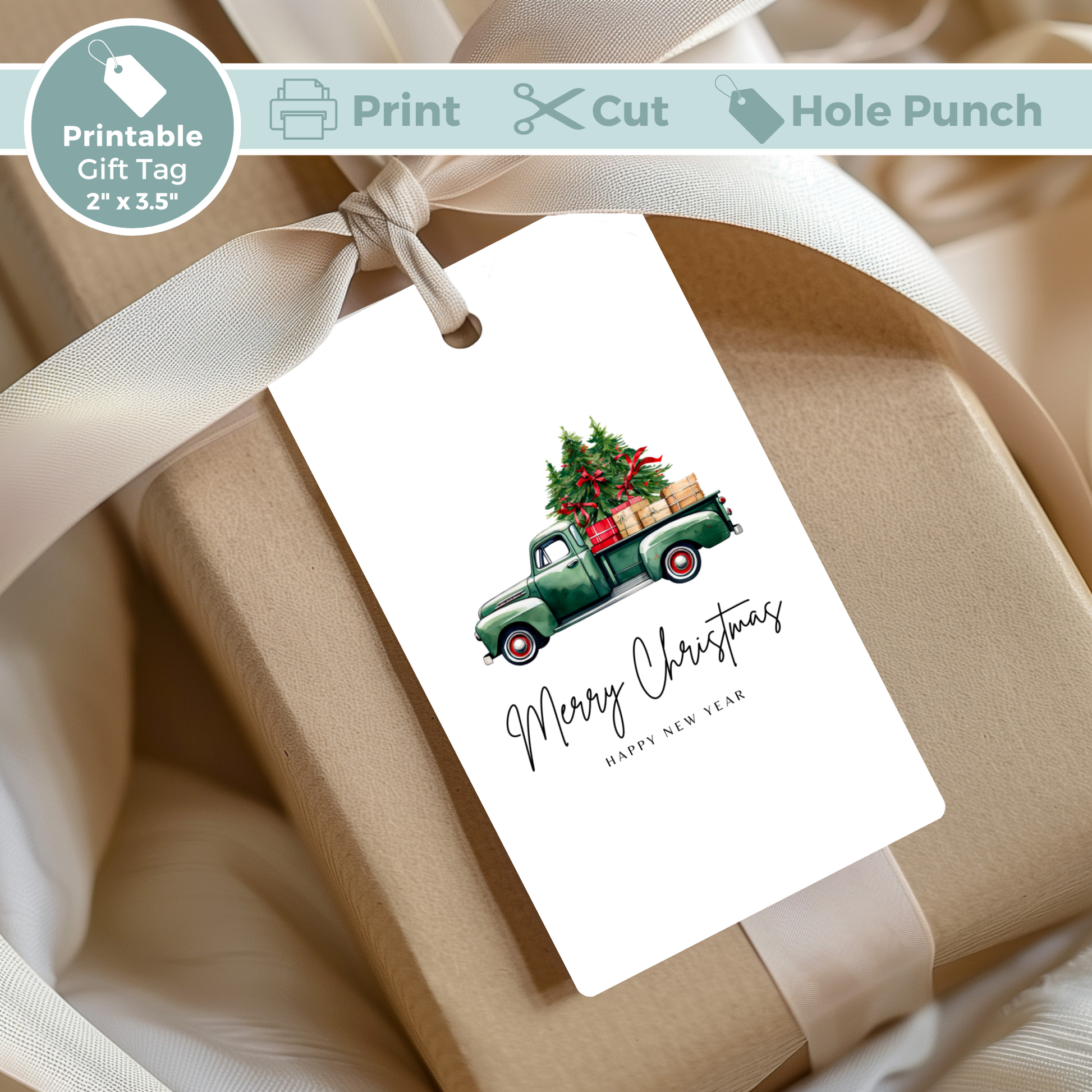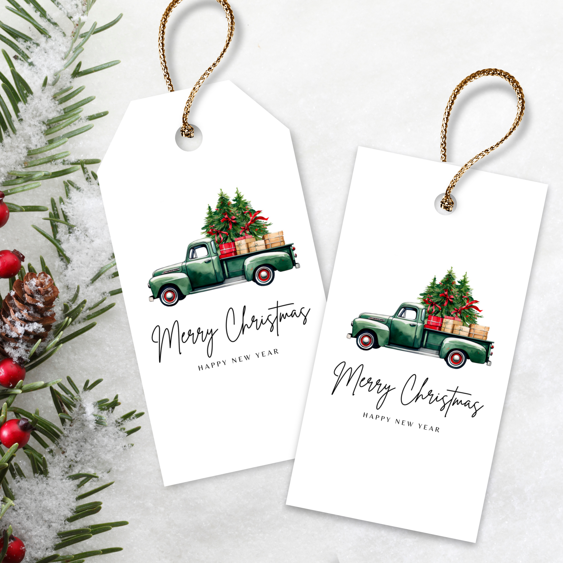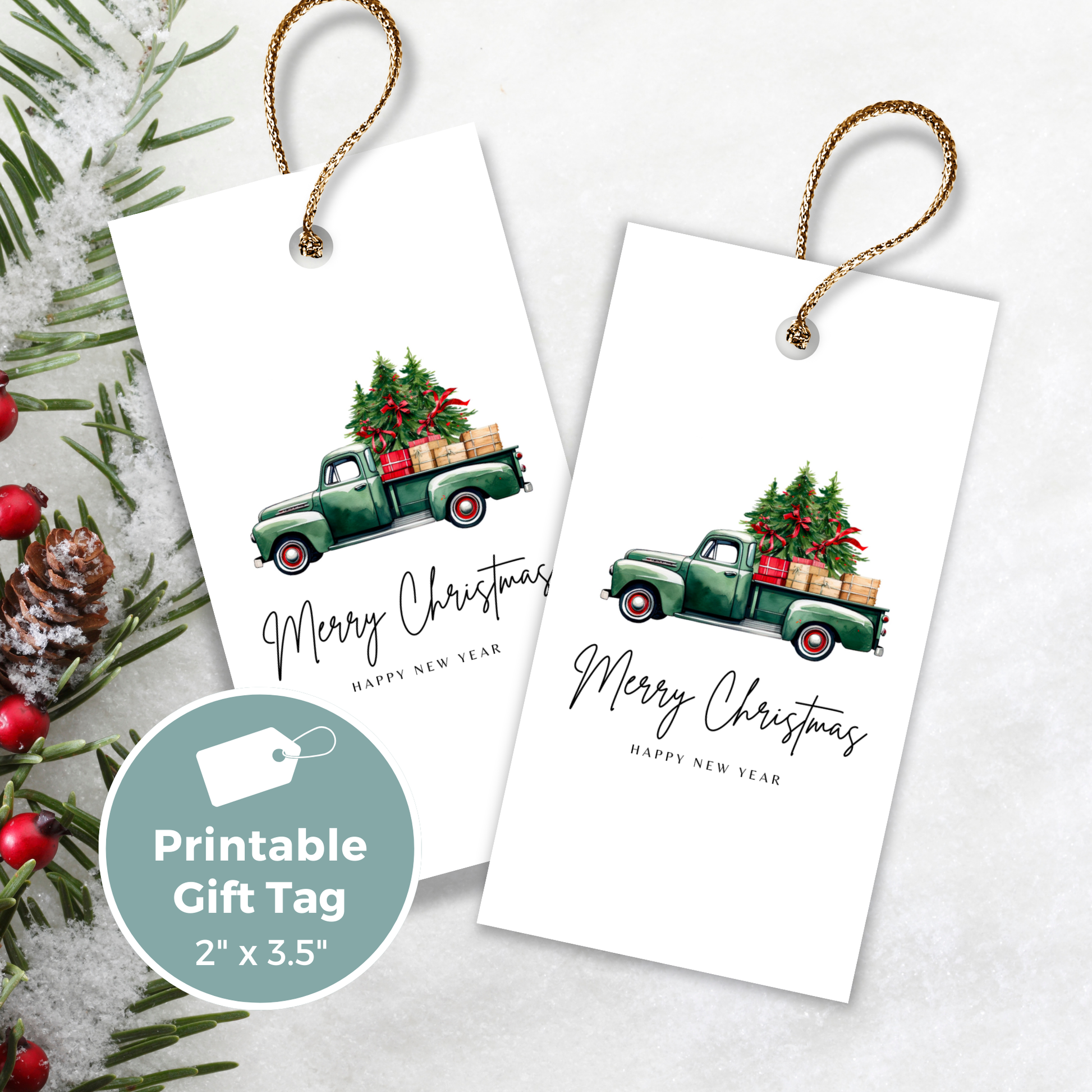 Add a stylish touch to your holiday gifts with this printable Christmas gift tag featuring a festive illustration of a vintage truck filled with a Christmas Tree and Presents.