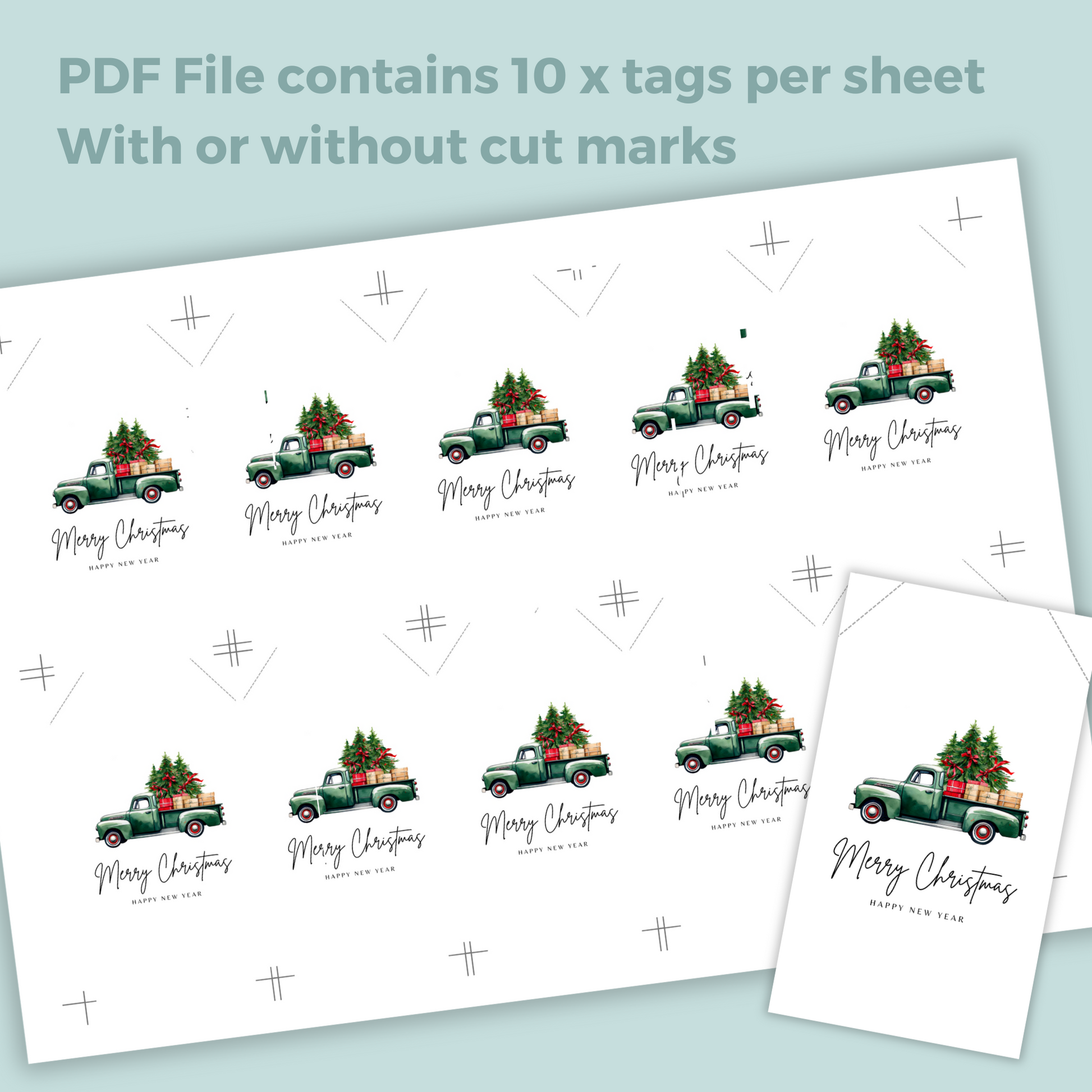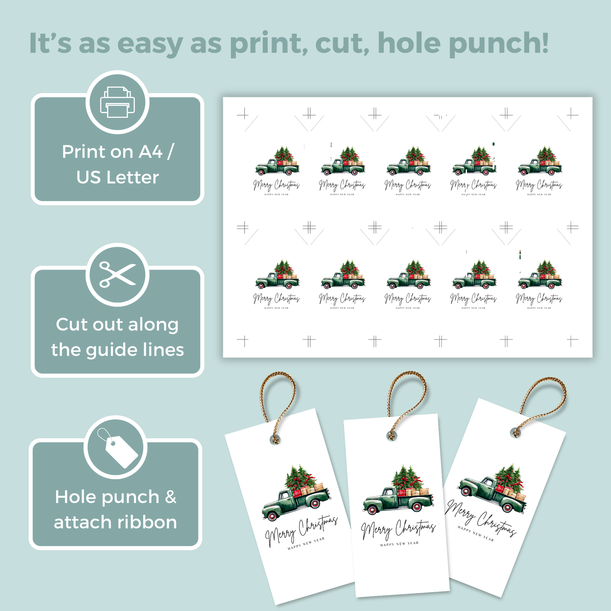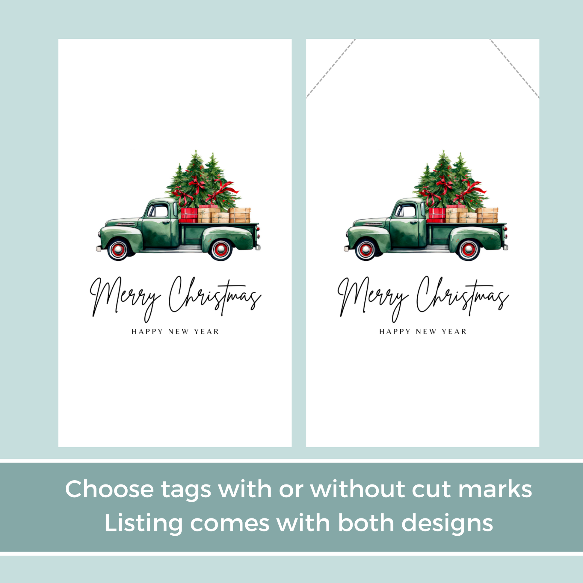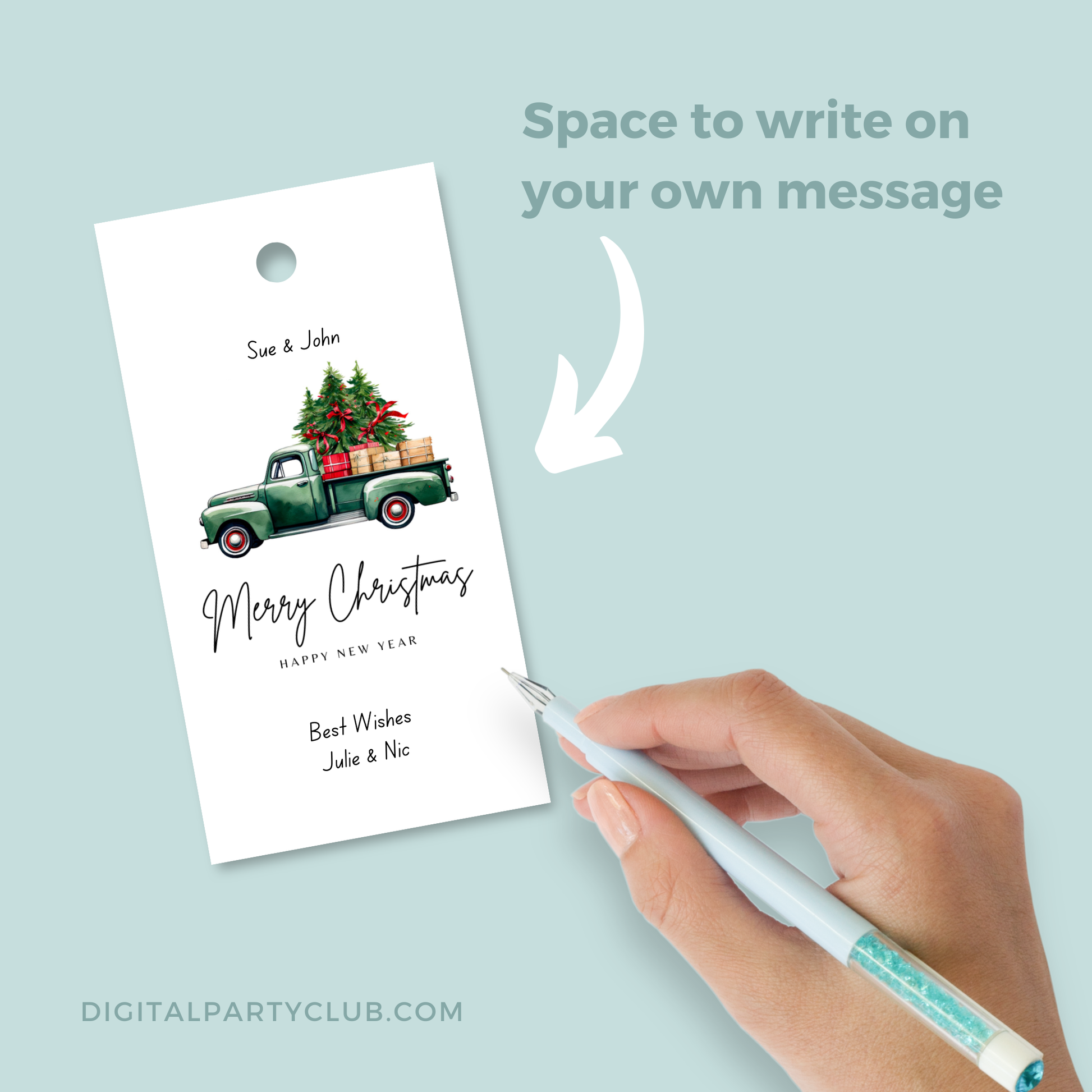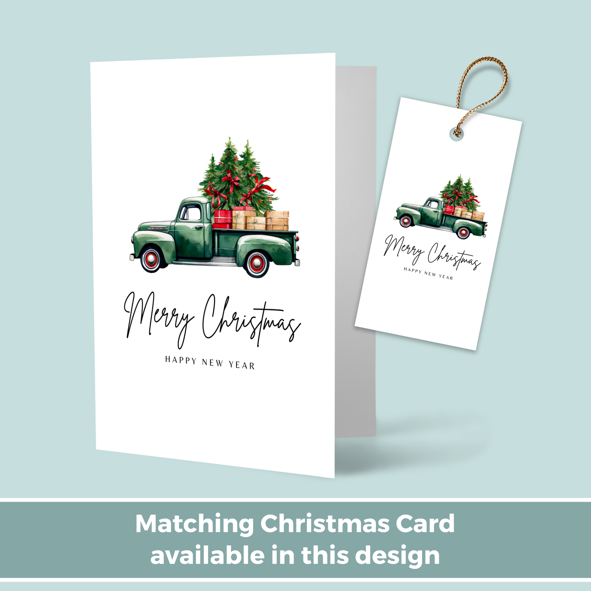 Add a stylish touch to your holiday gifts with this printable Christmas gift tag featuring a festive illustration of a vintage truck filled with a Christmas Tree and Presents.
